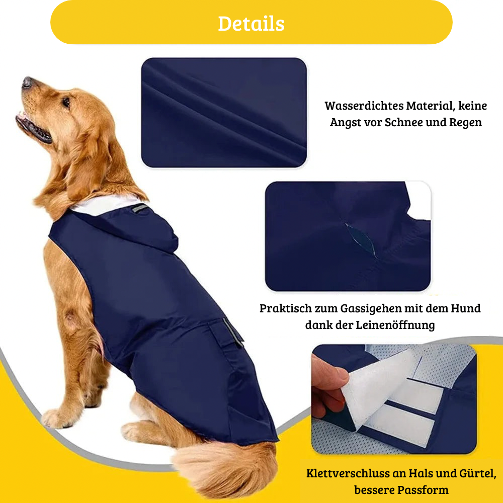 Ob beim Gassi gehen im Nieselregen oder bei starkem Schauer – der Mantel bietet zuverlässigen Schutz vor Nässe. Die wasserabweisende Außenschicht hält Feuchtigkeit fern, während dein Tier sich weiterhin frei bewegen kann. Die integrierte Kapuze schützt zusätzlich Kopf und Ohren vor Regen – ideal für sensible Tiere.